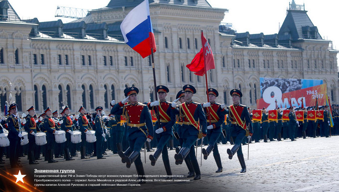 Đi đầu là đội rước cờ Liên bang Nga và Lá cờ Chiến thắng thuộc Trung đoàn Cận vệ Độc lập số 154 Preobrazensky, người cầm cờ là trung sĩ Anton Mikhailov và binh nhì Aleksei Fokeev. Chỉ huy đội rước cờ gồm đại uý Aleksei Ruklenko và thượng uý Mikhail Goryachev.