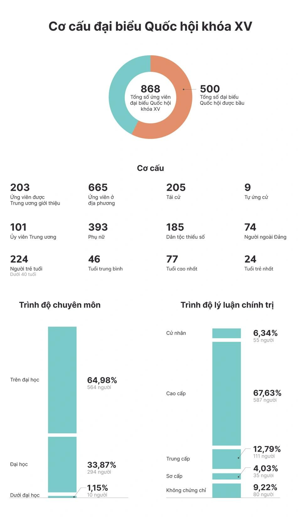 Trong 868 ứng viên đại biểu Quốc hội khóa XV có 203 người được Trung ương giới thiệu, 665 ứng viên ở địa phương; 101 ủy viên Trung ương; 205 người tái cử và 9 người tự ứng cử.
