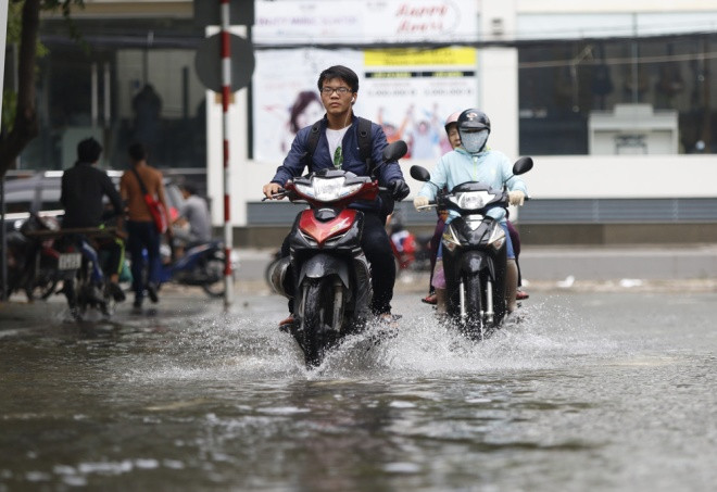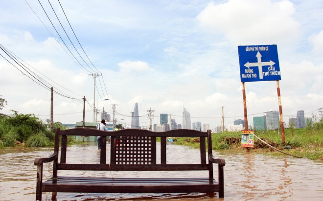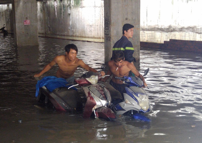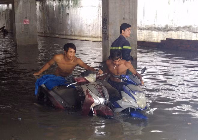 Trưa 27/9, nhiều tuyến đường ở TP HCM vẫn còn ngập hơn nửa bánh xe sau trận mưa lịch sử tối hôm trước. Các tuyến đường như Lương Định Của, Quốc Hương (quận 2), khu vực phường Hiệp Bình Phước (Thủ Đức)... nước mênh mông.