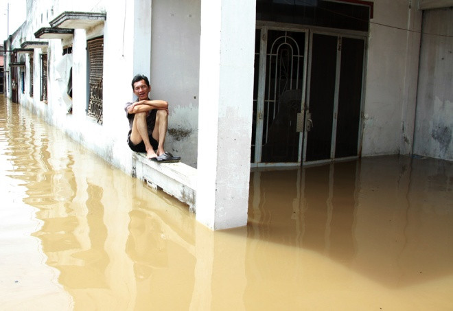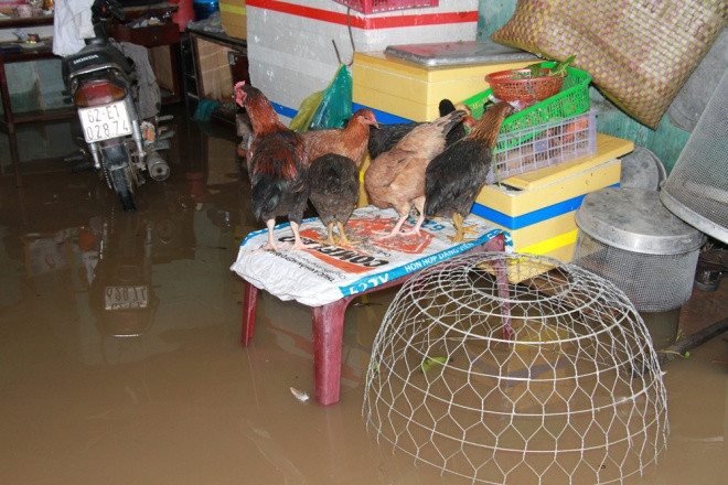 "Nước ngập từ chiều qua đến giờ đã hơn 18 tiếng rồi, ngán ngẩm quá nhưng riết cũng quen dù mọi sinh hoạt đều đình trệ. Người còn lội nước được chứ mấy con gà, con chó đều phải cho lên giường, lên bàn hết", chị này tếu táo.