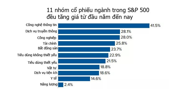 Tất cả 11 nhóm cổ phiếu ngành chính của S&P 500 đều đi lên. Trong đó, mức tăng lớn nhất 41,5% thuộc về nhóm cổ phiếu công nghệ. Các nhóm dịch vụ truyền thông, công nghiệp, tài chính, bất động sản, và tiêu dùng đều đạt mức tăng trên 20%.