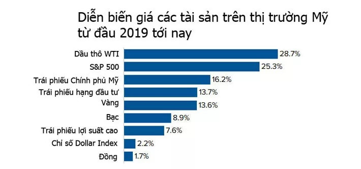 Chỉ số S&P 500 của chứng khoán Mỹ đã tăng 25% từ đầu năm. Trái phiếu kho bạc Mỹ, loại tài sản thường giảm giá khi giá các tài sản rủi ro như cổ phiếu tăng, cũng tăng giá. Dầu thô, vàng và trái phiếu doanh nghiệp đều mang lại mức lãi 2 con số.