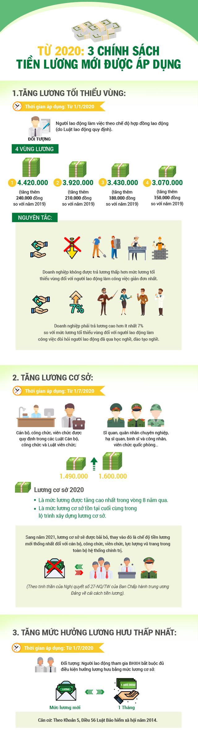 Năm 2020, người lao động được nhận nhiều chính sách tiền lương có lợi hơn với việc Quốc hội điều chỉnh lương cơ sở lên mức 1.600.000 đồng/tháng, lương tối thiểu vùng tăng từ 150.000-240.000 đồng trên 4 vùng và lương hưu tối thiểu cũng điều chỉnh tăng theo lương cơ sở mới.