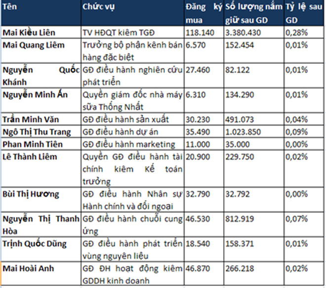 CTCP Sữa Việt Nam (Vinamilk) thông báo giao dịch nội bộ của 12 lãnh đạo chủ chốt của công ty. Theo đó 12 lãnh đạo này bao gồm Tổng giám đốc Mai Kiều Liên đăng ký mua vào hơn 400.000 cổ phiếu Vinamilk từ ngày 19/2 đến 18/3/2016. Nếu giao dịch thực hiện thành công, số lượng cổ phiếu Vinamilk do các lãnh đạo này nắm giữ là 6.799.269 cổ phiếu, tương đương 0,56% vốn điều lệ Vinamilk.