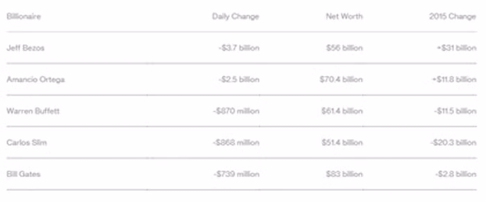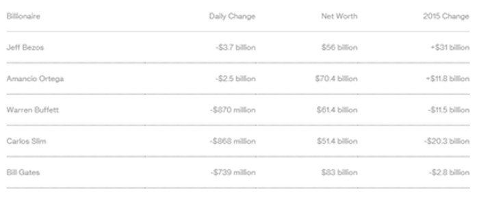 Người sáng lập Amazon.com Inc Jeff Bezos dẫn đầu danh sách mất mát trong chỉ số Bloomberg Billionaires trong ngày giao dịch đầu tiên của năm 2016, khi mất đi 3,7 tỷ USD, bởi cổ phiếu của Amazon giảm 5,8%. Hiện tại, tổng tài sản của Jeff Bezos còn 56 tỷ USD.