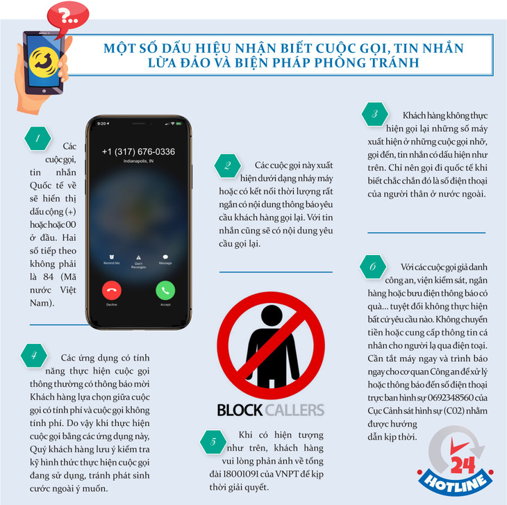 Khách hàng không thực hiện gọi lại những số máy xuất hiện ở những cuộc gọi nhỡ, gọi đến, tin nhắn có dấu hiện như trên. Chỉ nên gọi đi quốc tế khi biết chắc chắn đó là số điện thoại của người thân ở nước ngoài.