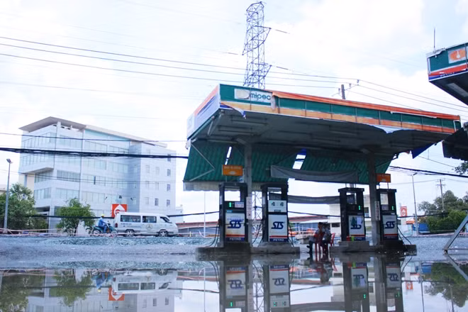 Mặt đường được nâng lên vài chục cm nên chỉ sau hai cơn mưa lớn, nước tràn vào gây ngập lênh láng ở trạm xăng dầu.