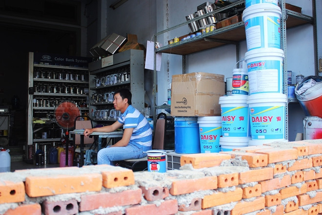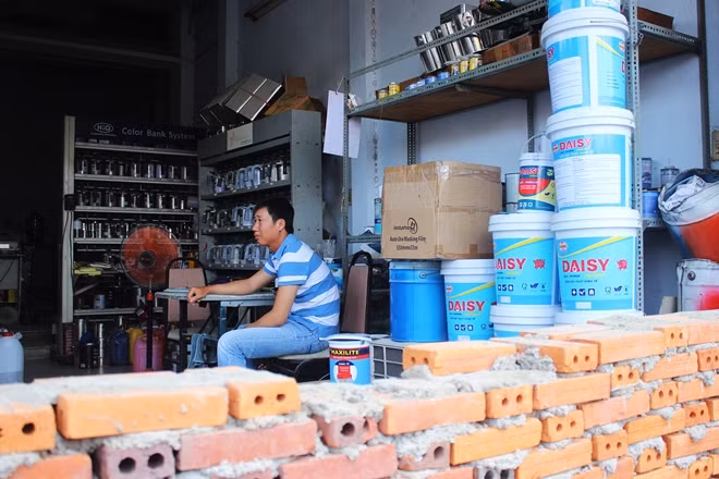 Cửa nhà bị che kín hơn phân nửa khiến không gian nóng bức. Ông Khang, chủ cửa hàng thiết bị nông cụ cho biết, dù bên ngoài nắng chói chang nhưng suốt ngày trong nhà phải mở đèn và bật quạt hết công suất.