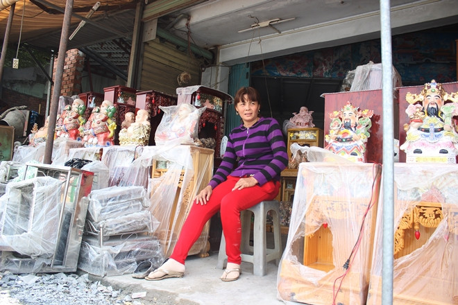 “Con đường này bụi mù mịt nên người ta đi theo đường tránh, nếu bất đắc dĩ chạy ngang đường này thì cũng ráng qua cho nhanh chứ không ai dừng lại mua hàng. Cửa hàng tôi cả tháng nay không có một khách vãng lai nào ghé xem hàng, doanh thu chỉ nhờ vào chuyển hàng cho các đại lý ở miền Tây”, bà Lê Thị Mỹ Lệ, chủ cơ sở trang trí nội thất Tiến Hòa cho biết.