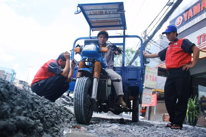 Dù mặt đường mới được đổ đá nâng thêm 30cm nhưng chiếc xe chở hàng cũng phải chật vật mới leo lên được.