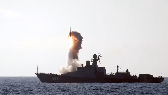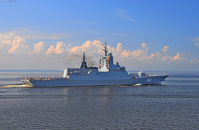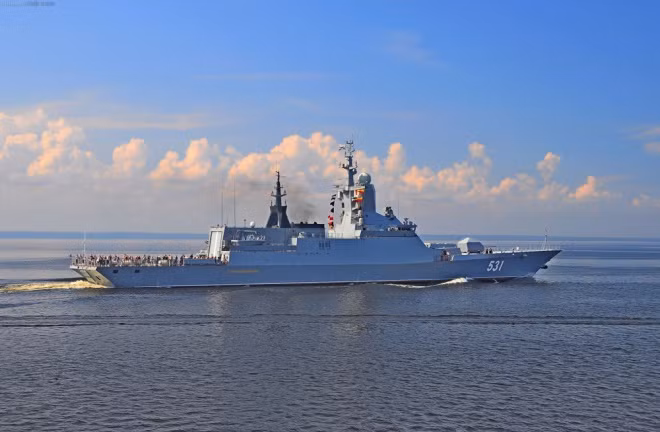 Tàu hộ vệ lớp Gepard dài 102 m, rộng 13 m, lượng giãn nước đầy tải 1.930 tấn. Chiếc Dagestan mang theo 8 tên lửa hành trình Kalibr-NK (tầm bắn 1.500-2.500 km), một tổ hợp pháo - tên lửa phòng không Palash. Ảnh: Global Military Review.