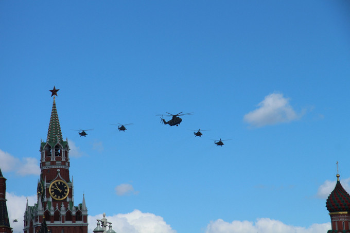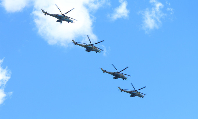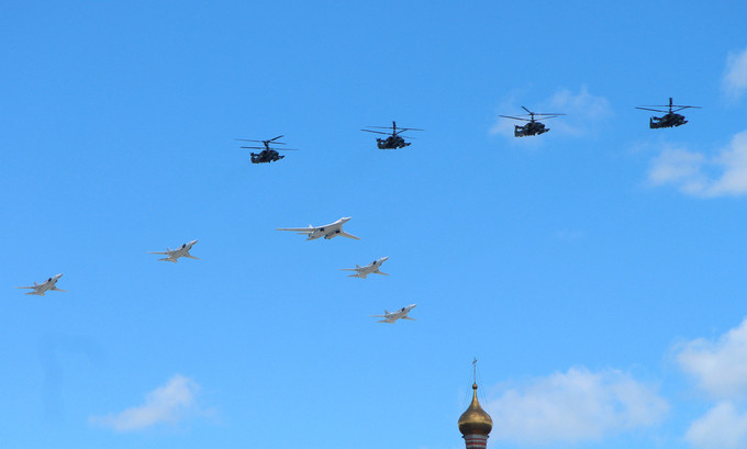 Đội trực thăng Mi-35 bay qua Quảng trường Đỏ. Toàn bộ các loại khí tài tham chiến tại Syria đều góp mặt trong lễ duyệt binh năm nay, như trực thăng Mi-28 và Mi-35, tiêm kích Su-30SM, Su-34, Su-35, máy bay ném bom Tu-22M3, Tu-95MSM và Tu-160.
