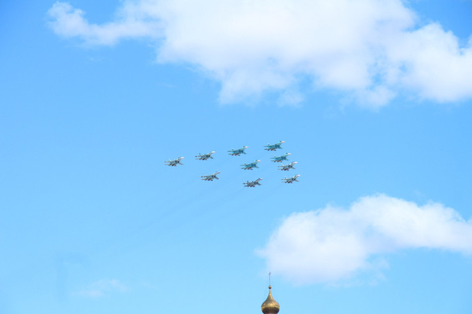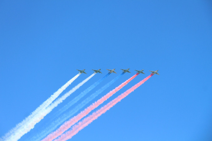 Kết thúc màn duyệt binh trên không sẽ là nhóm 6 máy bay cường kích Su-25 xả ra ba làn khói màu, tượng trưng cho quốc kỳ Nga trên bầu trời Moscow.