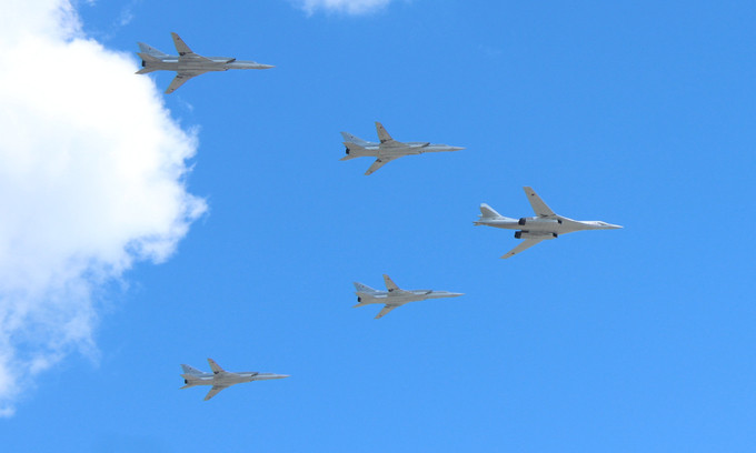 Điểm nhấn năm nay là đội hình máy bay ném bom siêu âm chiến lược, gồm một chiếc Tu-160 dẫn đầu và 4 phi cơ Tu-22M3 phía sau. Đây là lần đầu tiên không quân Nga triển khai đội hình này trong lễ duyệt binh.