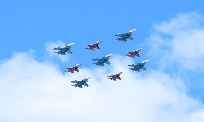 Các máy bay chiến đấu của quân đội Nga tập duyệt binh trên không trong ngày 4 và 5/5, trước khi tham gia buổi tổng duyệt cho lễ duyệt binh Ngày Chiến thắng vào hôm 7/5.