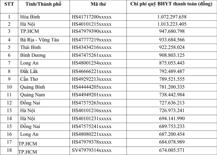 Một số trường hợp HSSV được chi trả chi phí KCB BHYT cao trong năm 2019 và 2020 (tính đến ngày 10/9/2020)