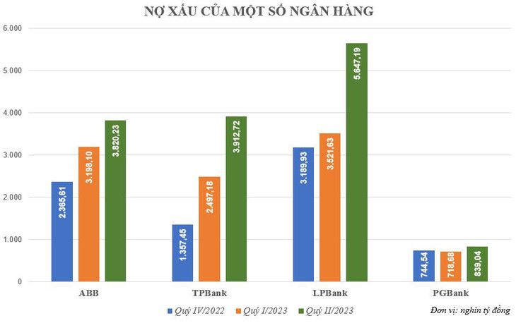 Tại LPBank, tỷ lệ nợ xấu ngân hàng tính đến 30/6/2023 là 2,23%, trong đó, nợ có khả năng mất vốn (nợ nhóm 5) tăng 80% lên 2.438 tỷ đồng. Tại PG Bank, nợ xấu tăng khá nhanh, tính đến 30/6/2023 là 2,77% trên tổng dư nợ cho vay khách hàng.