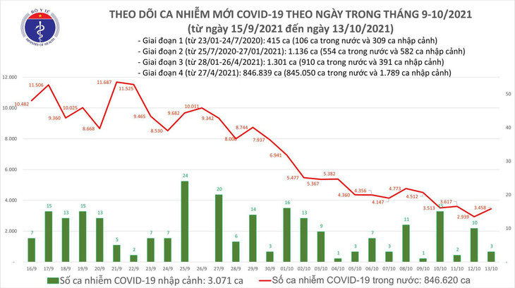 - Tính từ 17h ngày 12/10 đến 17h ngày 13/10, trên Hệ thống Quốc gia quản lý ca bệnh COVID-19 ghi nhận 3.461 ca nhiễm mới, trong đó 03 ca nhập cảnh và 3.458 ca ghi nhận trong nước (tăng 519 ca so với ngày trước đó) tại 47 tỉnh, thành phố (có 1.432 ca trong cộng đồng).