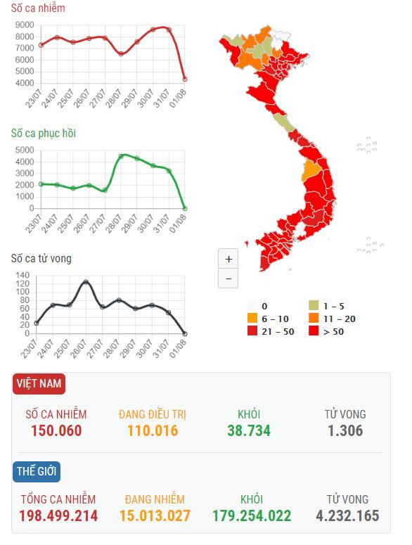 Như vậy, tính đến sáng 1/8, Việt Nam có 150.060 ca mắc trong đó có 2.241 ca nhập cảnh và 147.819 ca mắc trong nước. Số ca mắc mới ghi nhận trong nước của đợt dịch kể từ ngày 27/4 đến nay là 146.249 ca, trong đó có 35.960 bệnh nhân đã được công bố khỏi bệnh.