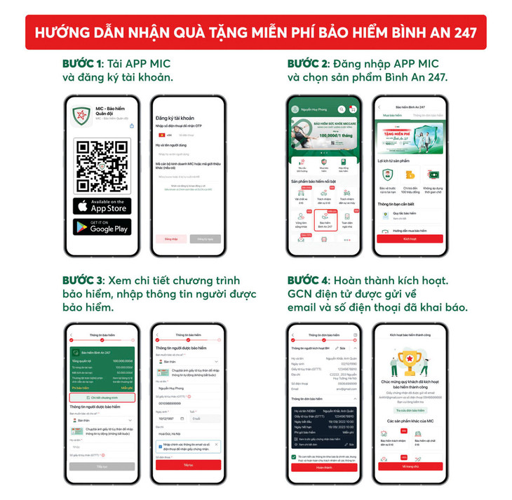 Theo đó, chương trình Bảo hiểm Bình An 247 sẽ dành tặng cho khách hàng và được kích hoạt thông qua ứng dụng MIC khi khách hàng đăng ký trên App. Đây là chương trình bảo vệ với độ tuổi mở rộng áp dụng từ 1 tuổi đến 65 tuổi. Theo đó, khi có các tai nạn bất ngờ không may xảy đến, Bảo hiểm Bình An sẽ luôn đồng hành và chia sẻ gánh nặng tài chính, giúp khách hàng sớm ổn định cuộc sống. Quý khách hàng có thể chủ động đăng ký, kích hoạt bảo hiểm ngay trên các thiết bị di động thông qua ứng dụng MIC trên Google Play hoặc Appstore.