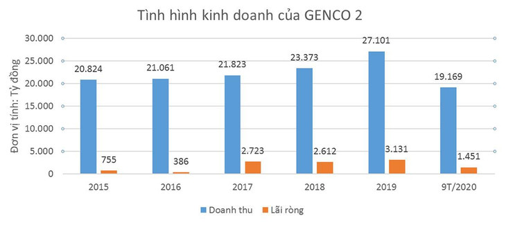 Kết quả kinh doanh 9 tháng đầu năm 2020 của GENCO 2 ghi nhận doanh thu thuần đạt 19.169 tỷ đồng, tăng trưởng 6,39% so với cùng kỳ năm trước. Lợi nhuận sau thuế đạt 1.451 tỷ đồng, tăng 30,6%.