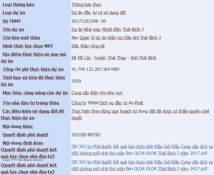 Tuy nhiên, không biết vì lý do gì, bằng tài khoản chứng thư số được cấp của mình, Ban QLDA điện lực dầu khí Thái Bình 2 đã công bố Công ty TNHH Dịch vụ đầu tư An Phát là nhà đầu tư trúng thầu Dự án Nhà máy Nhiệt điện Thái Bình 2. Theo thông tin công bố của Bên mời thầu, đây là dự án đầu tư có sử dụng đất, hình thức lựa chọn nhà đầu tư là đấu thầu rộng rãi; tổng chi phí thực hiện Dự án là hơn 41.799 tỷ đồng, thời hạn và tiến độ thực hiện Dự án là năm 2018.