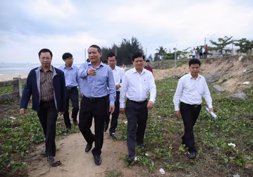 | Bí thư Thành ủy Đà Nẵng Trương Quang Nghĩa (bìa phải) xem bản đồ dự án nghỉ dưỡng ở Nam Ô và chỉ đạo tháo gỡ ngay hàng rào chắn sát mép biển. |