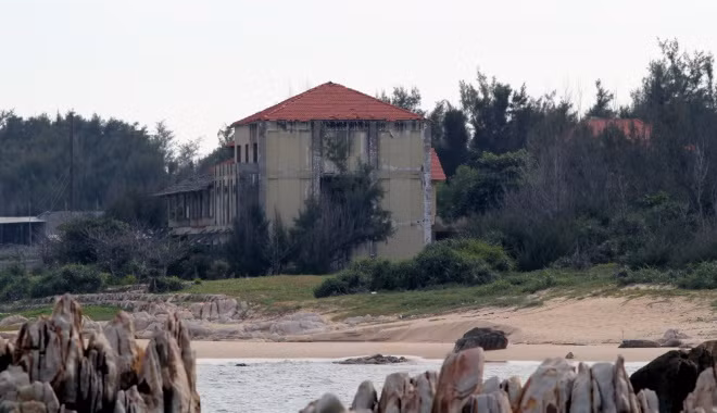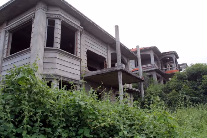 Dãy biệt thự cao cấp xây nửa chừng phải dừng lại nằm cheo leo bên một quả đồi ven biển không có bảo vệ. Để tiếp cận được những căn nhà này thì phải băng qua nhiều lớp cỏ dại phủ kín lối đi.