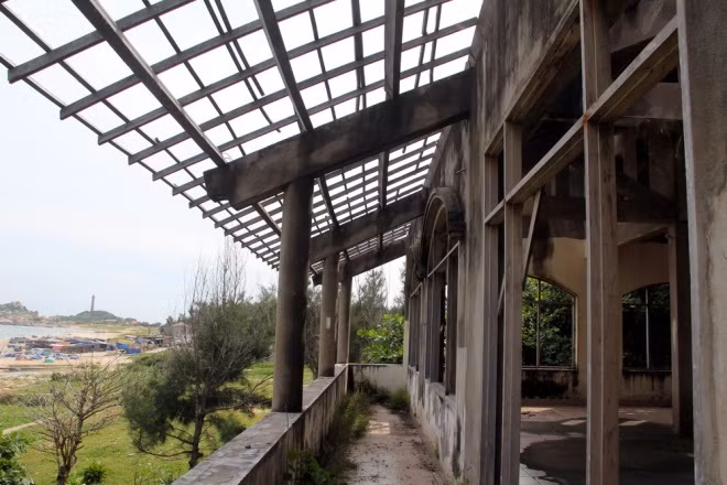Một tòa nhà mặt tiền được làm bằng gỗ nhìn ra biển và ngọn hải đăng Kê Gà trong Khu du lịch Đồi Phong Lan giờ hoang tàn, mục nát.