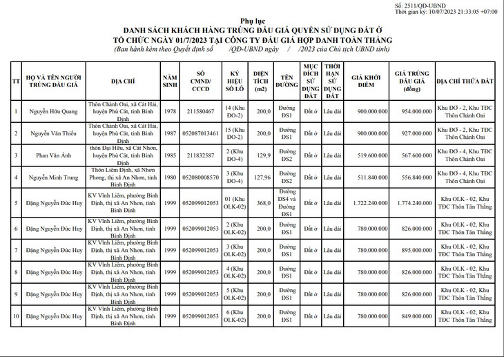 (BĐT) - UBND tỉnh Bình Định vừa phê duyệt kết quả trúng đấu giá quyền sử dụng đất ở tổ chức ngày 1/7/2023 do Công ty Đấu giá hợp danh Toàn Thắng tổ chức.