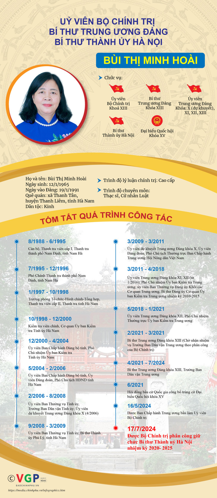 Chiều ngày 17/7, Thành ủy Hà Nội tổ chức hội nghị cán bộ chủ chốt thành phố để công bố Quyết định của Bộ Chính trị phân công bà Bùi Thị Minh Hoài, Ủy viên Bộ Chính trị, Bí thư Trung ương Đảng, Trưởng Ban Dân vận Trung ương giữ chức Bí thư Thành ủy Hà Nội nhiệm kỳ 2020-2025.