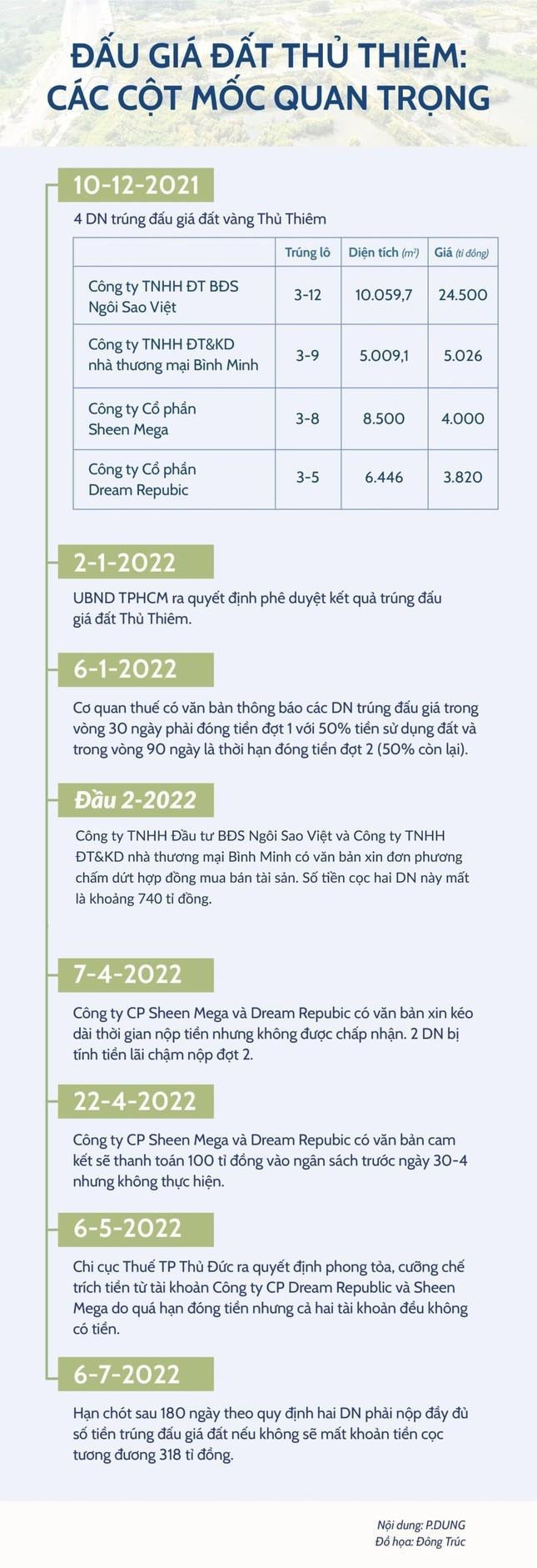 Trước đó, vào ngày 10/12/2021, Trung tâm bán đấu giá tài sản TPHCM đã tổ chức bán đấu giá 4 lô đất thuộc khu chức năng số 3 dự án khu đô thị mới Thủ Thiêm. Tuy nhiên chỉ một tháng sau, Công ty TNHH đầu tư bất động sản Ngôi Sao Việt, Công ty TNHH Đầu tư Phát triển và Thương mại Bình Minh đã xin bỏ tiền đặt cọc, không thực hiện dự án. Đến nay, hai DN còn lại là Công ty CP Dream Republic và Công ty CP Sheen Mega cũng vi phạm về thời hạn thực hiện nghĩa vụ nộp tiền sử dụng đất.