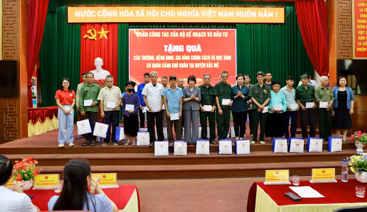 Cũng trong sáng 11/7, tại Hội trường Trung tâm huyện Bắc Mê, Thứ trưởng Nguyễn Thị Bích Ngọc và Đoàn công tác của Bộ Kế hoạch và Đầu tư đã tặng quà cho 45 thương, bệnh binh của huyện Bắc Mê. Đoàn cũng tặng quà cho 20 cháu có hoàn cảnh đặc biệt khó khăn trên địa bàn huyện Bắc Mê.