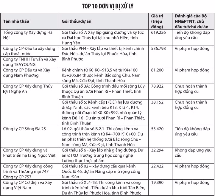 Trong bản đánh giá tổng hợp năng lực của nhà thầu mới đây, Bộ NN&PTNT cũng nêu danh 15 nhà thầu thi công xây dựng và 1 nhà thầu tư vấn giám sát không được tham dự các gói thầu mới cho đến khi chủ đầu tư xác nhận kết quả hoàn thành gói thầu, kèm theo báo cáo năng lực mới của nhà thầu được Bộ NN&PTNT chấp thuận.