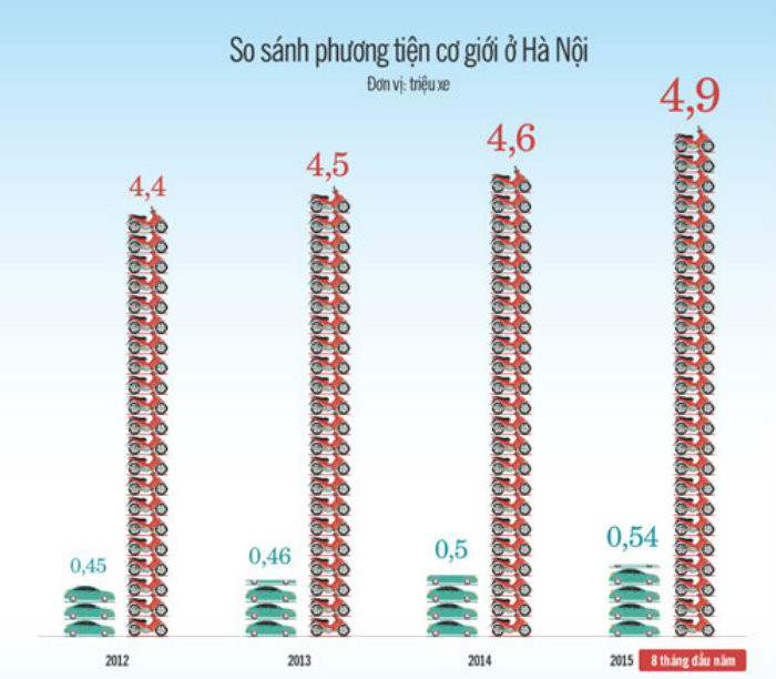 Ông Chung cho hay, bình quân hàng tháng trên địa bàn thành phố có 18.000-20.000 xe máy đăng ký mới và từ 6.000-8.000 ôtô đăng ký mới, với tốc độ này và nhất là từ năm 2018 khi các dòng thuế liên quan giảm, thì đến năm 2020 Hà Nội có gần 1 triệu ôtô (chưa kể ôtô của các lực lượng vũ trang), 7 triệu xe máy.