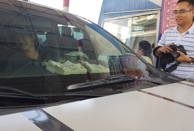 "Phương tiện làn kế bên không phải mua vé mà vẫn được qua trạm, tôi cũng không mua", tài xế Thảo điều khiển ôtô bán tải biển số Cần Thơ nói với nhân viên của trạm tại làn thu phí và chuẩn bị sẵn từng lốc tiền lẻ trên xe.