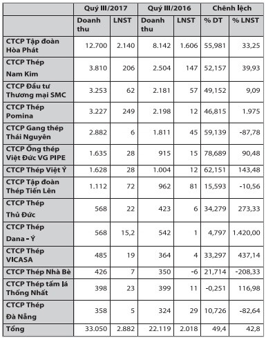 Doanh thu quý III/2017 của 14 doanh nghiệp trong ngành thép được khảo sát đều tăng trưởng trên 2 con số. Đồng thời, lợi nhuận sau thuế của các doanh nghiệp này cũng đều ghi nhận tăng trưởng, ngoại trừ Công ty CP Tập đoàn Thép Tiến Lên và Công ty CP Gang thép Thái Nguyên suy giảm lợi nhuận, Công ty CP Thép Nhà Bè chuyển từ lỗ sang lãi.