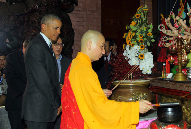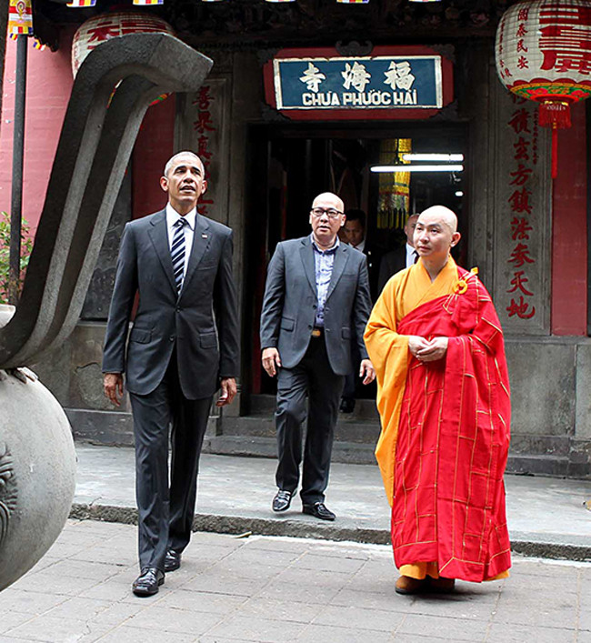 Vừa đặt chân đến TP HCM, Tổng thống Obam đã đến thăm chùa Ngọc Hoàng - còn gọi là chùa Phước Hải (thuộc Giáo hội Phật giáo Việt Nam) - trên đường Mai Thị Lựu, quận 1, TP HCM. Ảnh:Gia Khanh