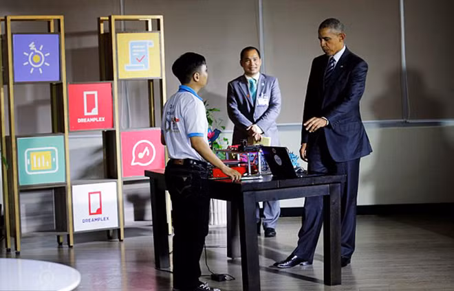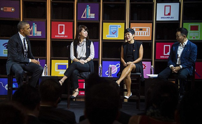 Trong một giờ giao lưu, Tổng thống Obama đã hoàn toàn chinh phục hơn 100 doanh nhân, doanh nghiệp có mặt tại không gian khởi nghiệp Dreamplex khi trực tiếp giữ vai trò dẫn dắt cuộc trò chuyện với 3 doanh nhân trẻ tiêu biểu của Việt Nam. Ảnh: Reuters