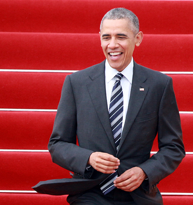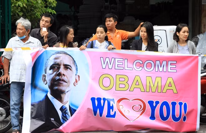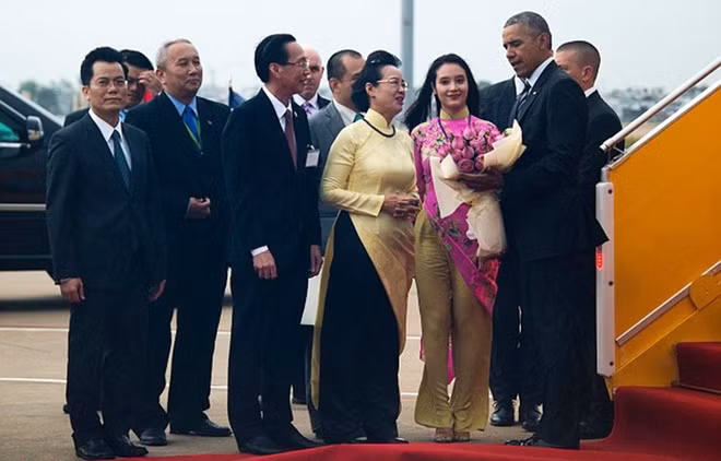 Ít phút sau, Tổng thống Obama bước xuống sân bay Tân Sơn Nhất trong chiếc áo sơ mi trắng, vest đen. Ông tươi cười vẫy tay chào mọi người đang đón ở sân bay.