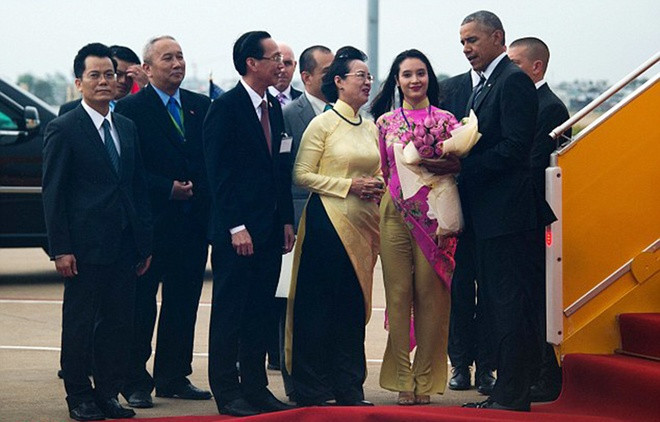 Hoa khôi Sở Ngoại vụ TP HCM Huỳnh Ái My thay mặt người dân TP HCM tặng hoa cho Tổng thống Obama. My là cựu sinh viên khoa Quan hệ quốc tế Đại học Khoa học Xã hội và Nhân văn TP HCM. Ảnh: AFP