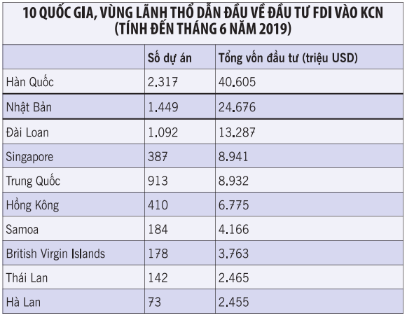 Kết quả thống kê về đối tác đầu tư cho thấy, hiện nay có 65 quốc gia và vùng lãnh thổ có dự án đầu tư vào KCN, KCX Việt Nam. Hàn Quốc là quốc gia dẫn đầu với 2.317 dự án và tổng vốn đầu tư đạt 40.605 triệu USD, chiếm 27% về số dự án và 30% tổng vốn đầu tư vào KCN, KCX của cả nước. Đứng thứ hai là Nhật Bản với 1.449 dự án và tổng vốn đầu tư đạt 24.676 triệu USD. Đứng thứ ba là Đài Loan với 1.092 dự án và tổng vốn đầu tư đạt 13.287 triệu USD.