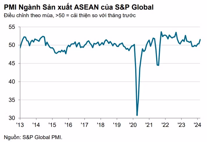 S&P Global cho biết, Chỉ số PMI ngành sản xuất ASEAN tăng từ 50,4 điểm trong tháng 2 lên đạt 51,5 điểm trong tháng 3, từ đó cho thấy các điều kiện kinh doanh cải thiện mạnh mẽ và mức cải thiện là đáng kể nhất trong gần 1 năm.