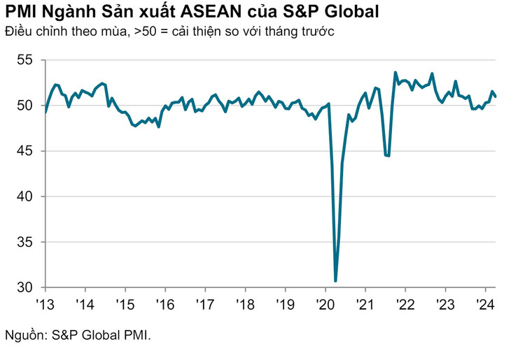 Chỉ số PMI toàn phần ngành sản xuất ASEAN của S&P Global nằm trên ngưỡng 50 điểm tháng thứ tư liên tiếp trong tháng 4. Với kết quả 51 điểm so với 51,5 điểm của tháng 3, chỉ số kỳ này cho thấy mức cải thiện nhẹ hơn của "sức khỏe" ngành sản xuất ASEAN.
