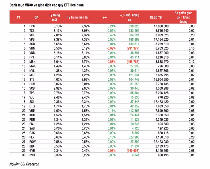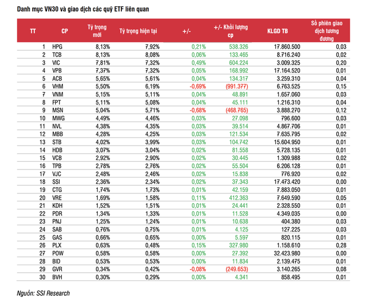 Trong các ETF trên thị trường, hiện có 4 ETF đang sử dụng chỉ số VN30 làm tham chiếu bao gồm VFM VN30, SSIAM VN30, Mirae Asset VN30, và KIM VN30 với tổng tài sản ước tính là 11.800 tỷ đồng. Theo ước tính, hầu hết các cổ phiếu sẽ được tăng tỷ trọng, ngoại trừ VHM, MSN và GVR giảm tỷ trọng. Cụ thể, VHM sẽ bị bán ra 991 nghìn cổ phiếu; MSN bị bán ra 468,7 nghìn cổ phiếu; GVR bị bán ra 249,6 nghìn cổ phiếu.