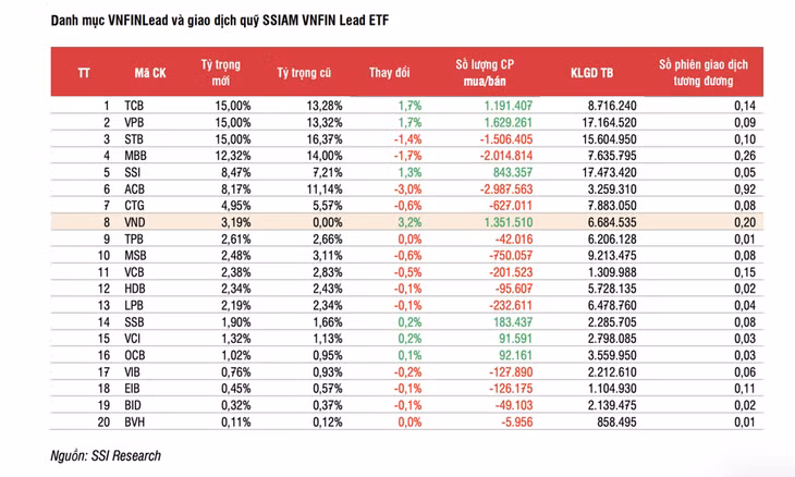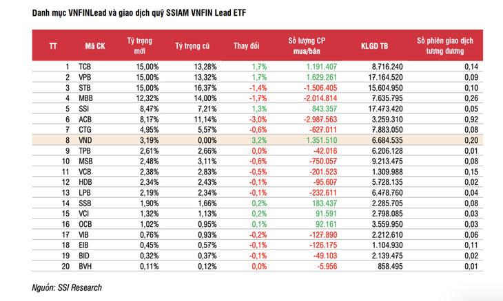 Chỉ số VNFIN Lead dự kiến sẽ thêm lại VND vào danh mục thành phần do cổ phiếu đã chuyển giao dịch về lại sàn HOSE. Đáng chú ý là tỷ trọng cổ phiếu trong lần thêm mới này gia tăng đáng kể so với trước đây, ước đạt 3,19%. Như vậy, quỹ SSIAM VNFIN Lead ETFt tổng tài sản ước tính 3.470 tỷ đồng có thể mua khối lượng mua 1,35 triệu cổ phiếu VND, bên cạnh TCB, VPB và SSI cũng sẽ được mua thêm với khối lượng đáng kể.