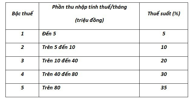 Cụ thể, mức thuế suất 5% cho các đối tượng chịu thuế có mức thu nhập tính thuế 10 triệu đồng/tháng.