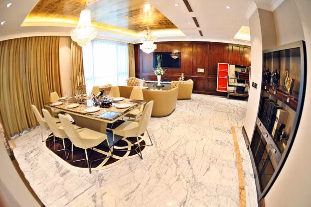 | Toàn bộ căn hộ được sử dụng những vật liệu đắt tiền như Đá Marble, tường ốp gỗ quý, sofa da bò |