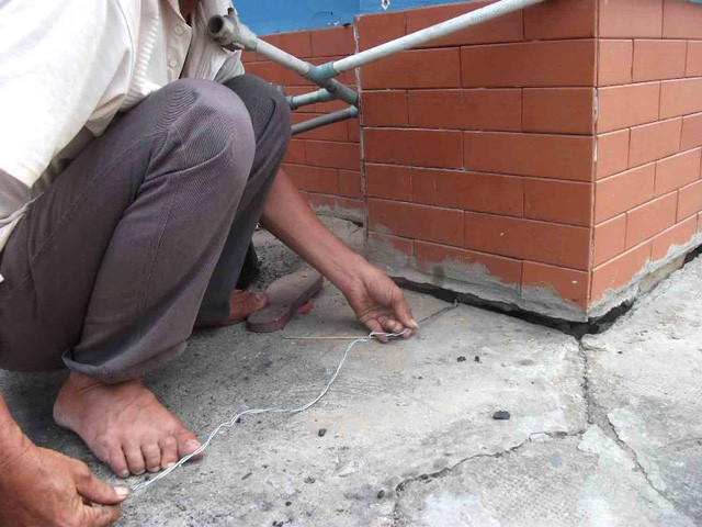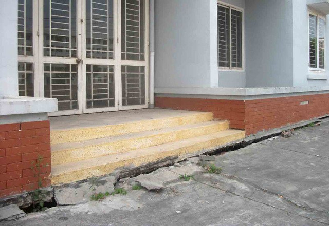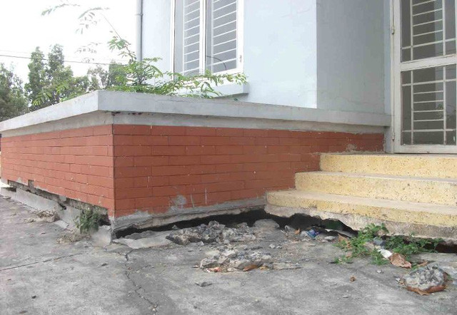 Theo ghi nhận của phóng viên, hầu như tất các các lô chung cư trong khu TĐC đều xảy ra tình trạng sụt lún vỉa hè, trần nhựa trên nhà gắn sơ sài, tường trong một số căn hộ bị thấm nước, hệ thống dây điện nằm sát ban công… Quan trọng nhất, tại một block, đứng cách đấy khoảng 500m chúng tôi vẫn có thể nhìn thấy rất rõ hiện tượng mặt đất sụt lún, hở hàm ếch lòi cả sắt thép bên trong.