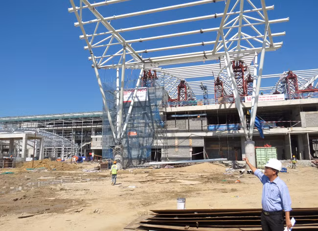 Các nhà thầu thi công những cấu kiện mái che nhà ga khổ lớn dưới cái nắng như đổ lửa. Theo ông Lê Khắc Hồng, Tổng giám đốc Công ty CP Đầu tư Khai thác nhà ga quốc tế Đà Nẵng (AHT), bình thường những dự án như ga quốc tế như thế này phải mất 3 - 4 năm mới có thể hoàn thành. Nhưng với AHT, dự án rút ngắn chỉ còn khoảng 16 tháng.
